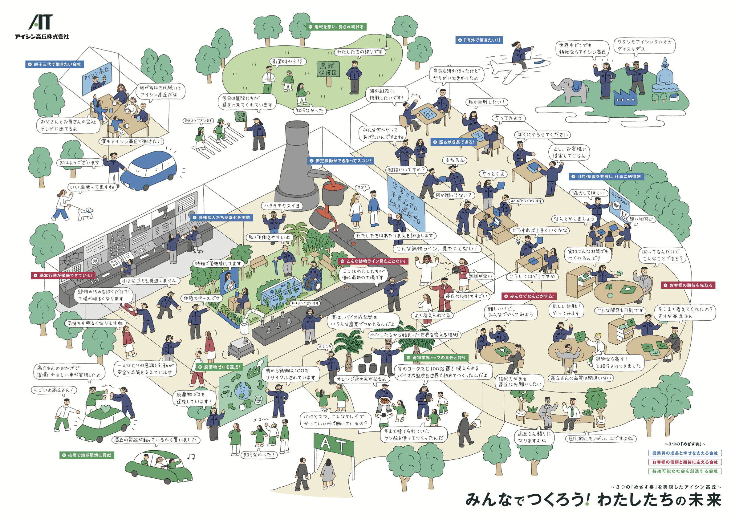 - アイシン高丘が創業時よりめざしてきた「自然と共存するインダストリアル・パーク(工場公園)」「ものづくり」を通じ、人と地球の未来にわたる調和と持続可能な社会の構築に貢献する。
